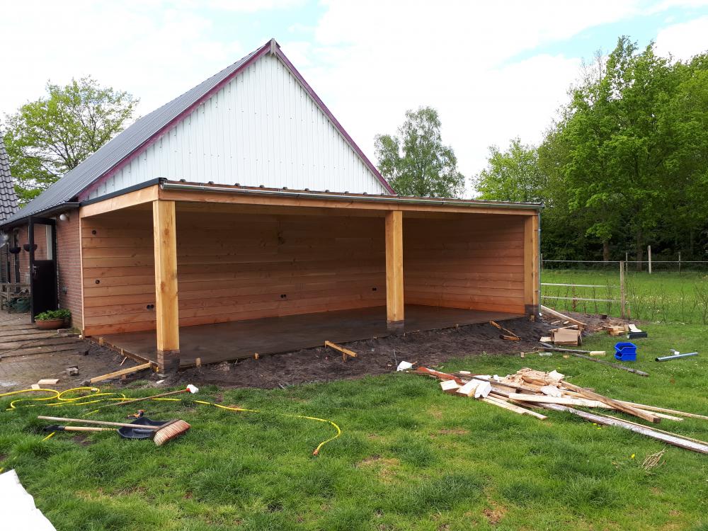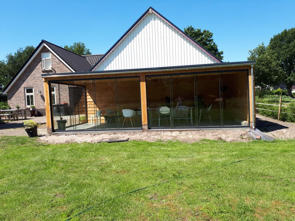 Ook hebben we hier de nieuwe veranda tegen de schuur aan gebouwd. Met een houten douglas constructie op gemetselde poertjes. de wanden netjes gepotdekseld. en er een mooie strak gevlinderde betonvloer als afwerkvloer in gestort. ook hebben we de glazen schuifpuien geleverd en gemonteerd.